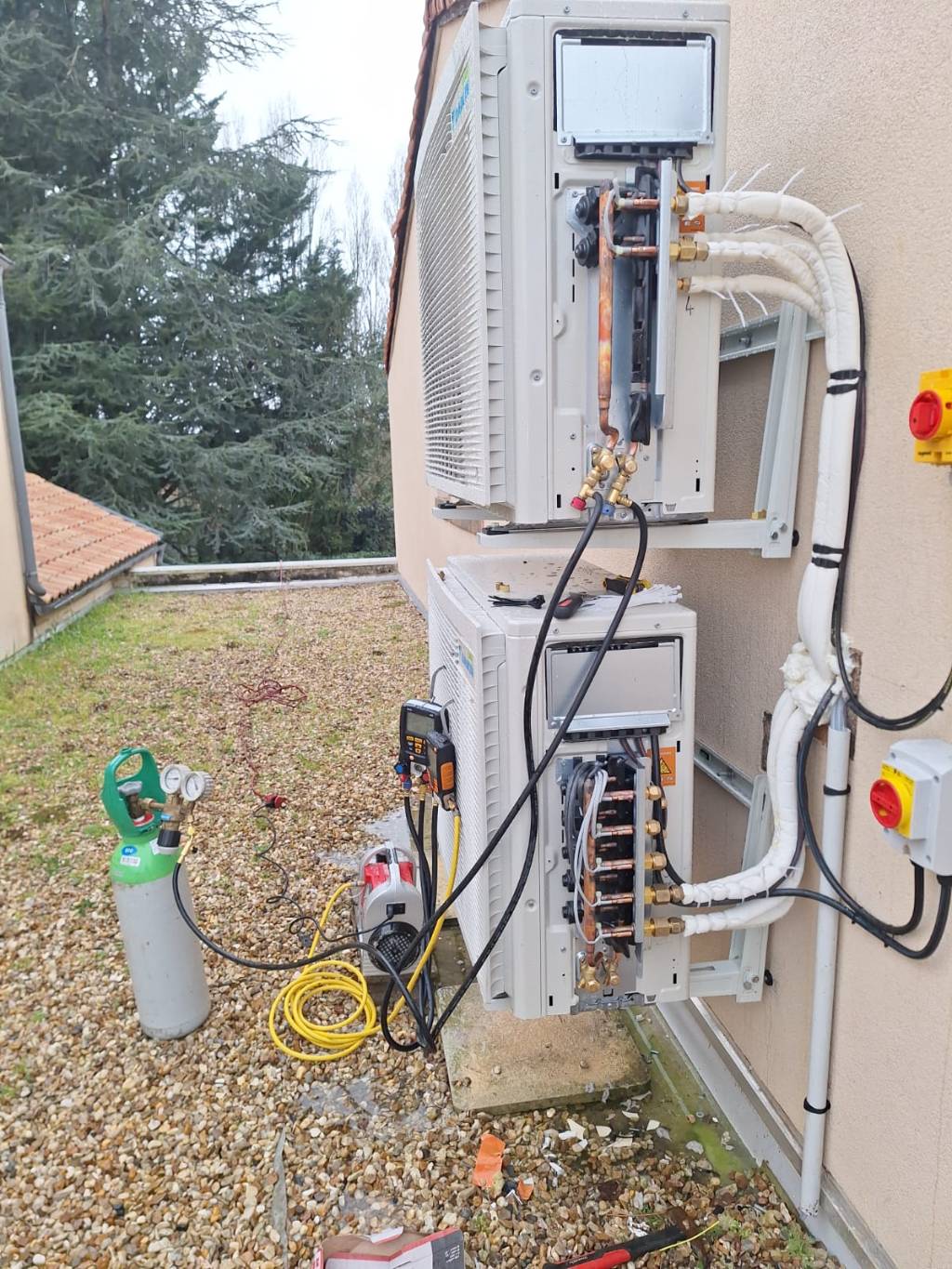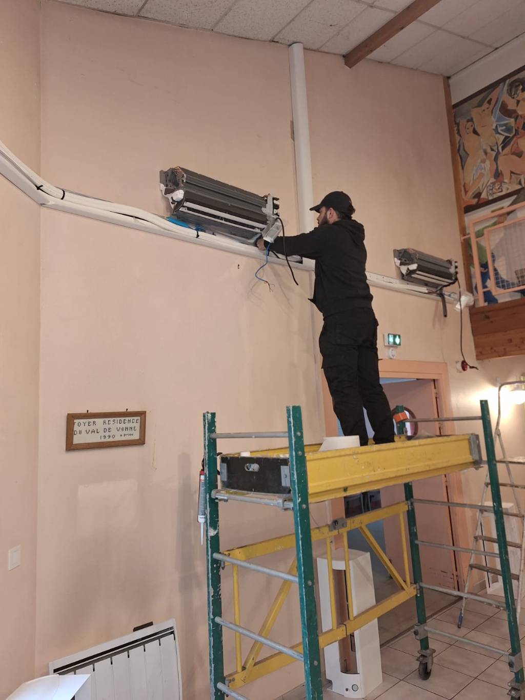 À Lusignan, dans la Vienne (86), nous avons réalisé l’installation d’une pompe à chaleur air/air multisplit 4 sorties – 9 kW – gamme Perfera Daikin dans une salle de réception, afin d’améliorer significativement le confort thermique été comme hiver.Le propriétaire souhaitait offrir à ses clients un espace agréable en toutes saisons : une salle fraîche lors des fortes chaleurs estivales et parfaitement chauffée pendant l’hiver, tout en conservant une solution économique et performante.