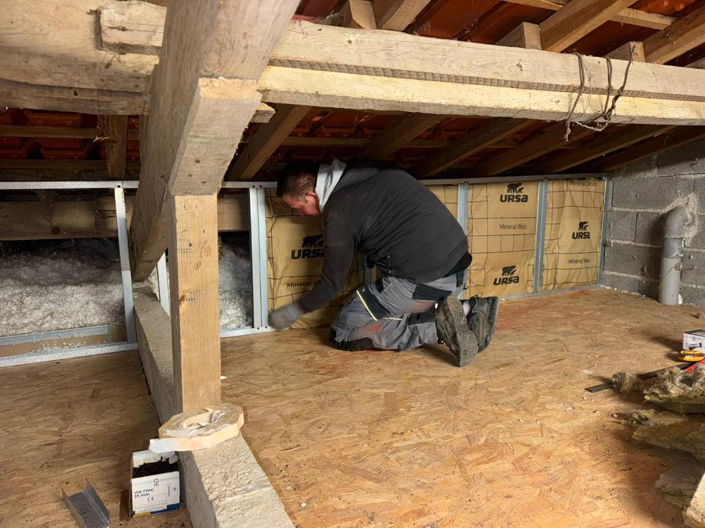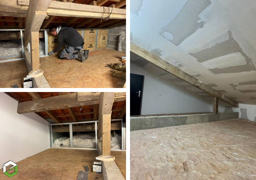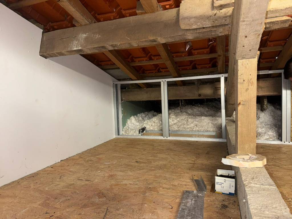 L’aménagement de combles nécessite une préparation soignée afin d’assurer la solidité de la structure et le confort thermique futur de la pièce. Après étude de l’existant, nous avons procédé à la mise en place de l’ossature métallique destinée à recevoir les plaques de plâtre.