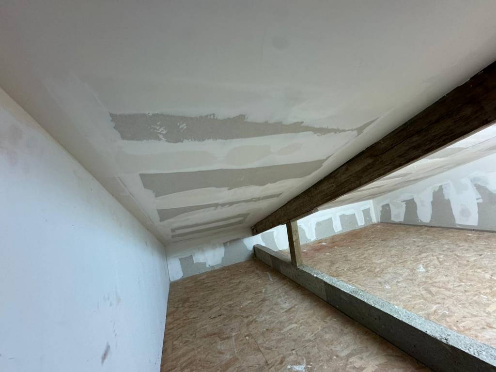 En complément du plafond rampant, un doublage en plaques de plâtre a été réalisé sur les murs périphériques. Cette étape permet :